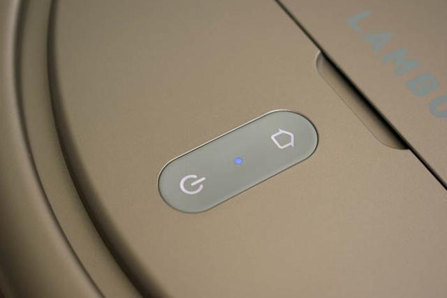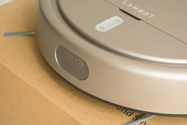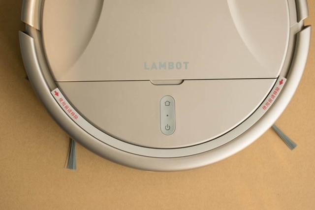 扫地机器人的前面是可浮动有弹性的防撞框,所以出厂有一根白色的橡胶条嵌在框架和主机之间,是防止运输中晃动的,使用的时候就拿走了。下面有一个灰色的按钮条,可以看到有2个触摸按钮和一个指示灯。从标记看,一个是电源,另外一个是回家会充电座充电的标记。中间的盖子写有LAMBOT的英文字样。