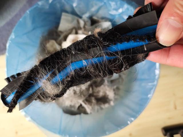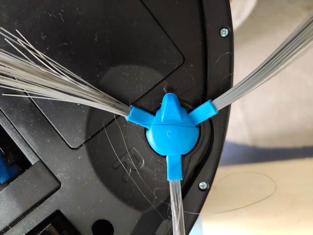 将扫地机器人翻过身来,看机滚刷的部分,有缠绕的毛发。
