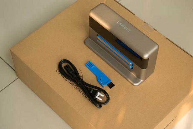 配件有充电底座、清洁工具和充电线。充电线有白色的插头护套,而充电底座,是采用立式的,两个蓝色框就是2个有弹性的金属触点的充电接触点。
