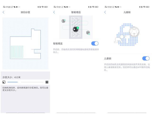 岚豹扫地机器人还有一些其他的功能和设置,比如,它是一个区域一个区域来探索和清扫的,那么,这个区域默认是3米的一个正方形,而这个边长,是可以自定义改变的。还有可以设置儿童锁,只允许从手机app上控制,避免儿童误碰扫地机器人。