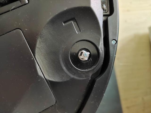 在扫地机的另外一侧,则是激光头的所在。外面是保护架子,里面蓝色的是激光头组件,激光组件工作时是不停转动扫描的,所以外面需要有保护。扫地机器人的后方侧面中间是2个金属充电条,同充电底座接触充电。两侧的栅栏,根据介绍一个是喇叭,一个是出风口。