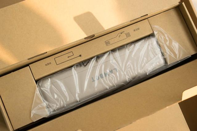 拿掉上面一层的保护纸壳后,下面就可以看见透明塑料袋里的岚豹扫地机器人了。