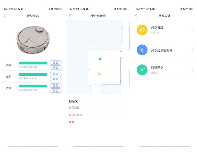 扫地机器人的耗材也可以看到使用的情况,看到磨损度好及时更换,地图上的充电座和扫地机器人的标记也可以更换。