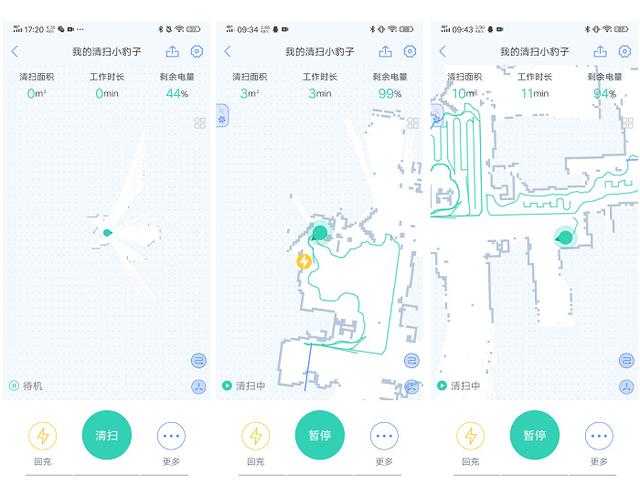升级完固件之后,就可以开始工作了。将扫地机器人放置在充电座上,从而可以让扫地机器人记住开始的起点,然后直接按动APP界面上的清扫按钮,它就开始工作了。
