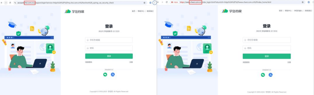 学信档案登录页面(左:官方网站,右:山寨“学信网”)