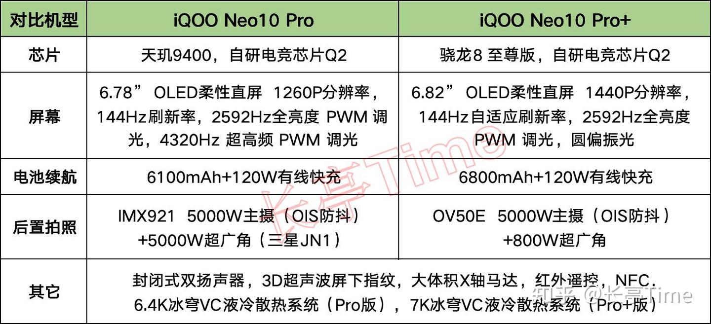 搭载天玑9400、骁龙8 至尊版芯片,性能极强;配合自研电竞芯片Q2、冰穹VC液冷散热系统、144Hz高刷屏、封闭式双扬声器、大体积X轴线性马达等,游戏表现极为出色;屏幕素质均非常不错,兼顾显示清晰度、色彩、亮度、护眼等多重优势,其中又以iQOO Neo10 Pro+屏幕更强,在目前3K价格段鲜有对手;续航均很强悍,其中iQOO Neo10 Pro+续航更强,iQOO Neo10 Pro则兼顾续航和轻薄手感于一体;搭载IMX921/OV50E后置主摄(传感器面积非常接近)+OIS光学防抖,拍照体验还算可以(iQOO Neo10 Pro的超广角更胜一筹);其它如NFC、红外遥控、3D超声波指纹识别、双频GPS等,均未缺席。性价比都很高。不足: