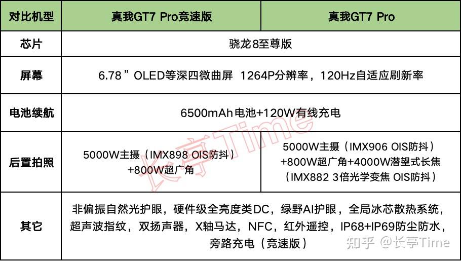 均搭载骁龙8至尊版芯片+LPDDR5X运存+UFS 4.0闪存,配合超大VC散热堆料,性能强悍,游戏体验不错;均搭载6500mAh超大容量电池+120W有线快充,续航和充电体验都很强悍;均搭载1.5K高素质OLED护眼屏,兼顾高亮度、清晰度、色彩、护眼体验等于一体;真我GT7 Pro后置IMX906主摄+IMX882潜望式长焦,拍照体验不错,尤其长焦在同价位相当能打;标配双扬声器、NFC、红外遥控、X轴马达、超声波指纹,支持IP68+IP69防尘防水,外围配置相当齐全;性价比极高(尤其真我GT7 Pro竞速版)。不足: