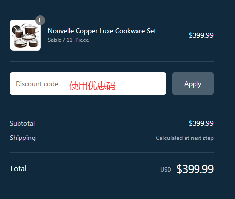 第三步:把所有需要购买的商品都加入购物车以后,就点击页面右上方的购物车符号。可以再查看一下购物车内东西是否齐全,数量款式是否正确等,然后有优惠码的话就填入优惠码点击使用!