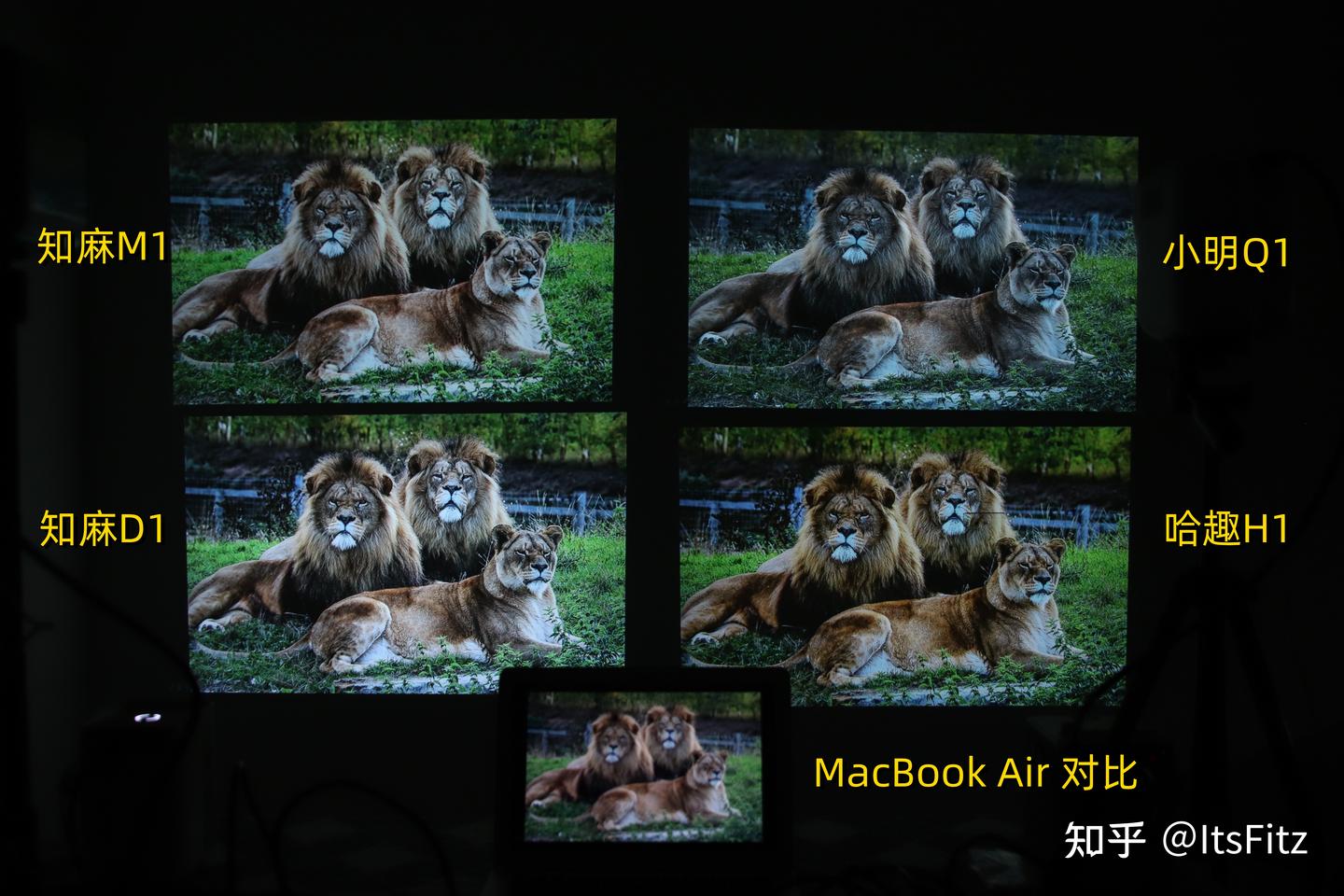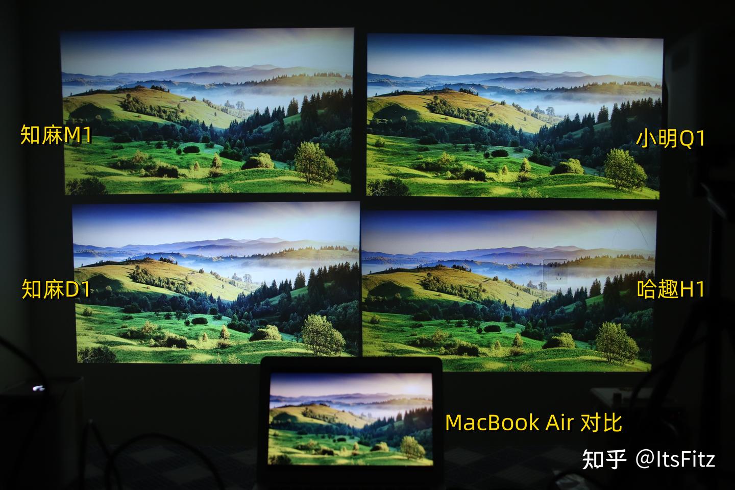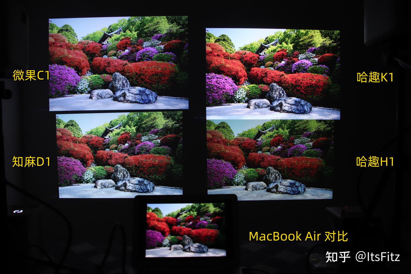 不过在下面对比中肯定有小伙伴问,为什么知麻D1看起来更亮。但亮度实测时知麻D1和哈趣H1的亮度差不多,所以知麻D1应该是在调色时提高了画面曝光,因此像画面中绿色部分就过亮,现场的实际效果还是哈趣H1更舒服的。