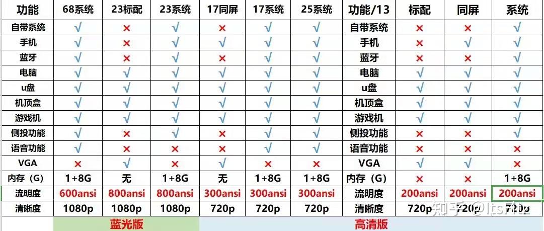 ✅ 先奇投影仪先奇的产品型号虽然少,但是基本上每款都分为同屏版和系统版,下方这张图更直观的看出先奇所有投影仪产品的差异。