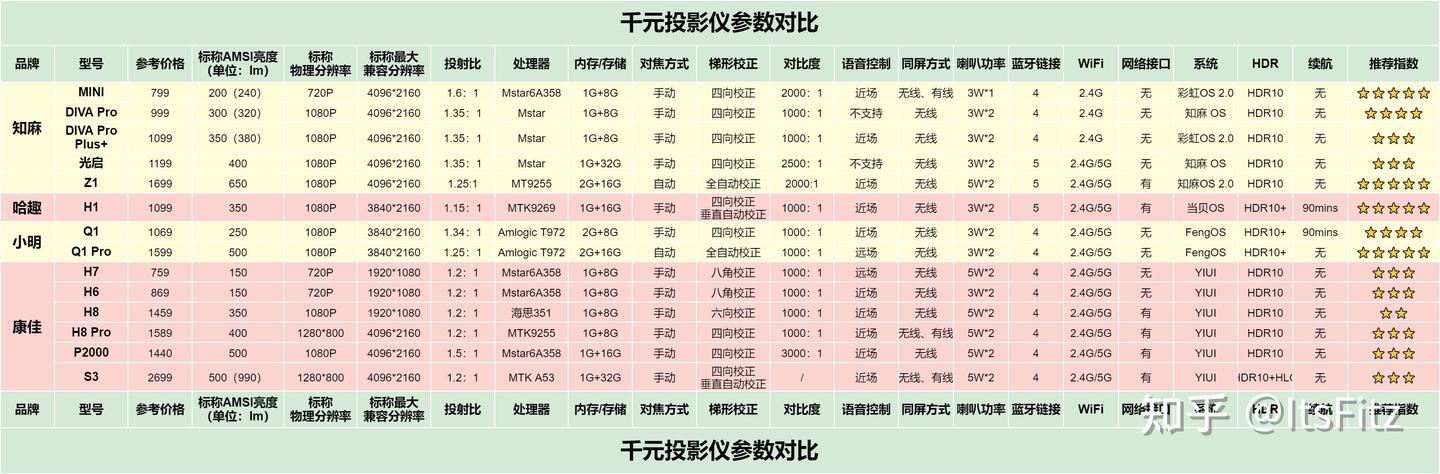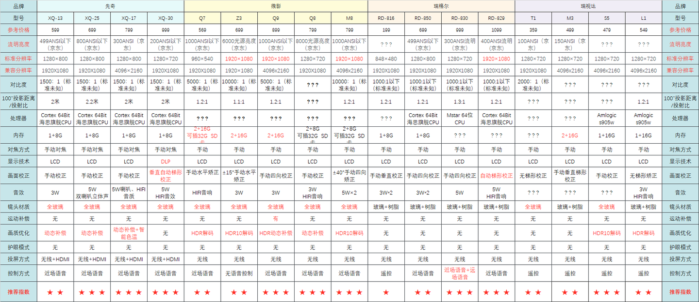 这个价位的投影仪参数不全,参数虚标属于正常情况,部分机型还分为不带智能操作系统的同屏版和带智能操作系统的系统版,选购时一定要多加注意,如果觉得表格太复杂就直接按推荐指数的 ⭐⭐⭐⭐⭐数量选购即可。