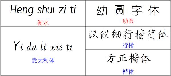分析中文字体与英文衡水体相似的中文字体是幼圆。与英文意大利体相似的字体是行楷(不连笔就是楷体)。