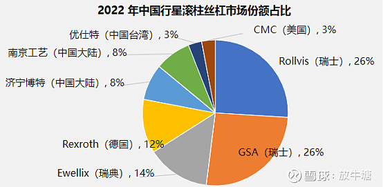 行星滚柱丝杠产能主要集中在欧、美,国内企业起步较晚,国内市场主要依靠海外进口。2022年国内行星滚柱丝杠市场集中在国外龙头制造商Rollvis、GSA和Rexroth,市场份额占比分别为26%、26%、12%。国内以南京工艺、济宁博特、优仕特为主。