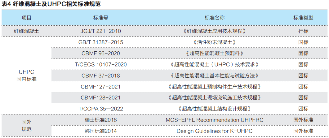 同时纤维增韧混凝土以及超高性能混凝土在混塔领域的研究与应用也逐年增加。虽现行建筑领域已有T/CECS10107-2020《超高性能混凝土(UHPC)技术要求》、JGJ/T221-2010《纤维混凝土应用技术规程》等行业标准或团体标准(见表4)。但UHPC结构设计材料性能取值相对保守,未能完全发挥其材料优势,在生产、制备工艺、强度评定及验收方面要求尚不明确,在混塔领域的应用属于探索和研发中。