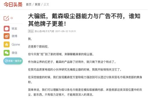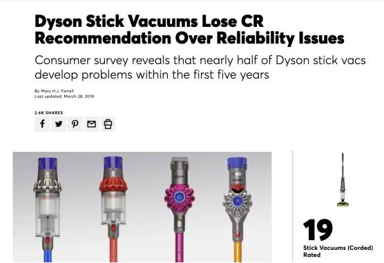 看到这里,也让我想起了此前美国权威消费杂志报道的一篇文章《Dyson Stick Vacuums Lose CR Recommendation Over Reliability Issues》,大概内容是:将戴森的产品从手持式真空吸尘器推荐名单中移除,原因是它的耐用性不尽如人意。这也意味着说,在质量方面戴森吸尘器与它的定价并不成正比。