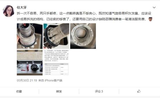 当然,说了这么多,我们还是没有讲到戴森吸尘器到底为什么会发臭。实际上,在网上有很多戴森吸尘器的用户都有反馈这个问题,无论是更换过滤芯、还是全部拆开清洗。都没有真正解决戴森吸尘器发臭的问题。因为,这本身就是戴森吸尘器的设计缺陷。根据微博网友表示:戴森吸尘器之所以会积灰、发臭,是因为采用了不方便普通用户拆卸清洁内部结构的多锥过滤器的设计,在我们使用的过程中,多锥过滤器很容易积灰,发臭。这也是为什么诸多用户在使用戴森吸尘器1个月至2个月时间后会发臭的主要原因之一。
