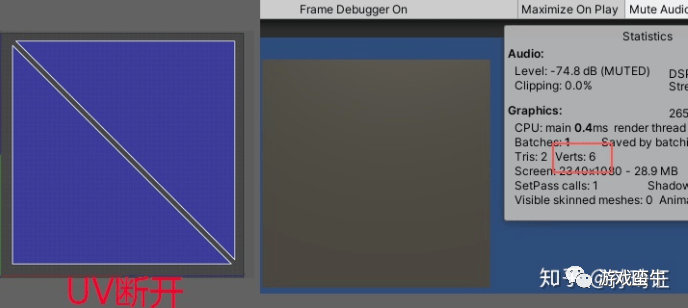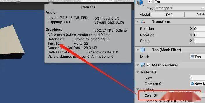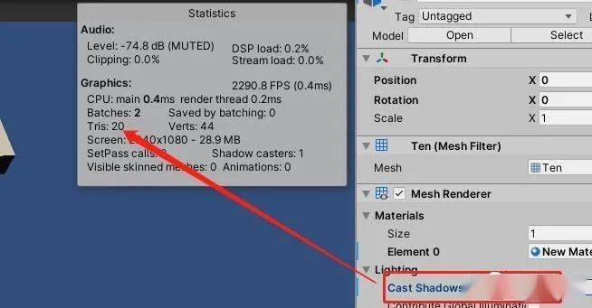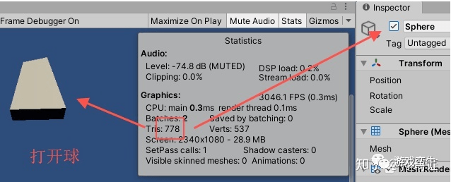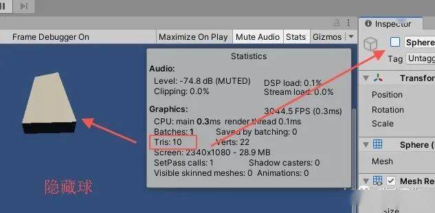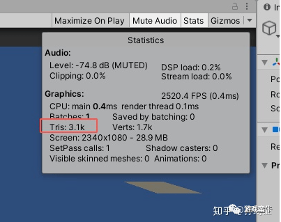然后在game面板的Stats去看同屏面数,如图所示,显示/隐藏那个面数很高的球,同屏面数差别很大。