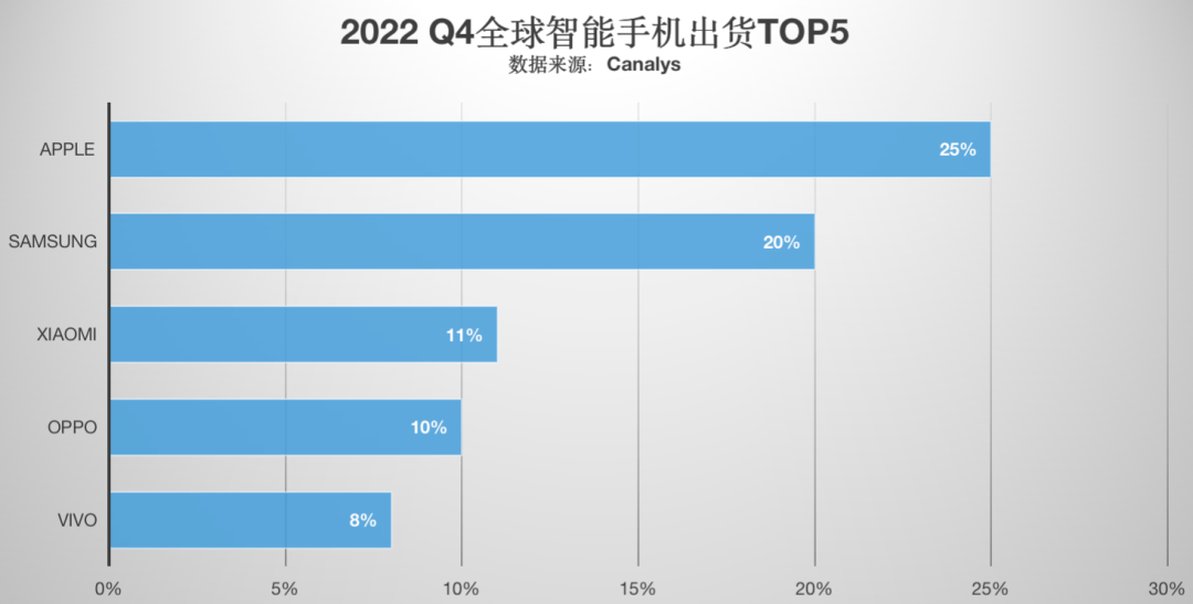 苹果在2022年第四季度占据了出货量榜首,市场份额占比25%,高于去年同期的23%,并创下历史新高;三星位列第二,市场份额占比20%,高于去年同期的19%;小米跻身前三,份额占比11%,低于去年同期的13%。
