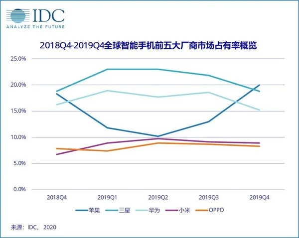 虽然苹果手机在2019年第四季度的全球发货量全球第一,但是并没有改变三星手机2019年全年的市场龙头地位。此外,中国厂商华为的全球手机出货量更是在今年反超苹果,成为全球第二大智能手机厂商。