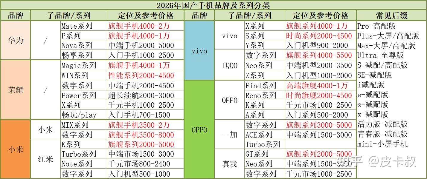 4000元以上的机型基本上都是各品牌的旗舰系列机型,也有少数是次旗舰系列机型。主要分布可见下表红色字体。