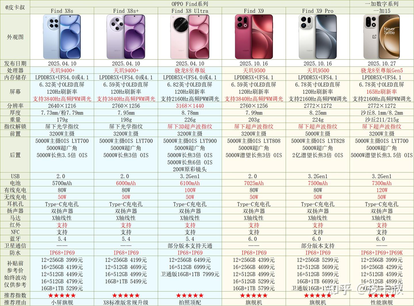 (四)OPPO、一加手机OPPO和其子品牌旗舰机参数对比如图。