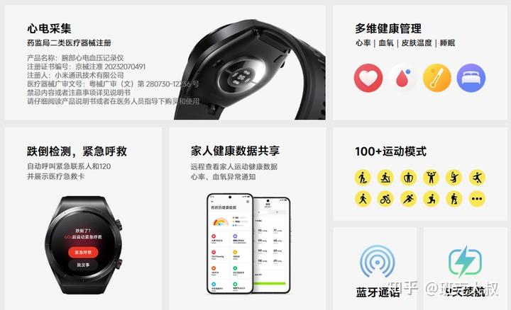医疗认证:手表获得药品监督管理局二类医疗器械注册证和市场监督管理局计量器具型式批准证书。其功能通过四川大学华西医院、301 医院、上海交通大学医学院附属瑞金医院、东莞市人民医院及中山大学附属第一医院等多家专业机构临床验证。