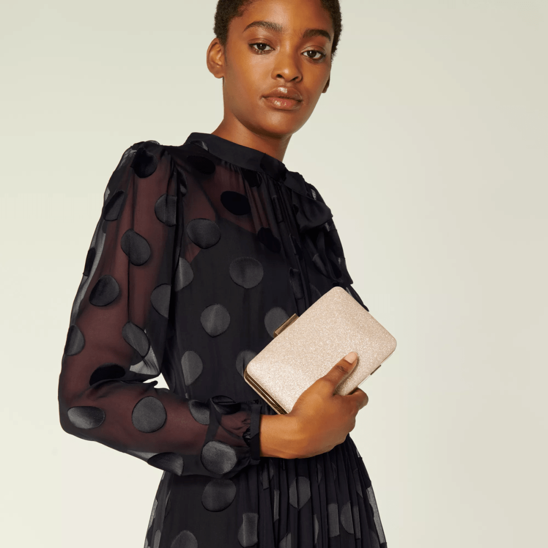 和凯特手里类似的款式,他家今年出了一款亮片表面的金属手拿包,淡粉色配色,能够搭配绝大部分服装,无论出席晚宴还是派对,用它都不违和。