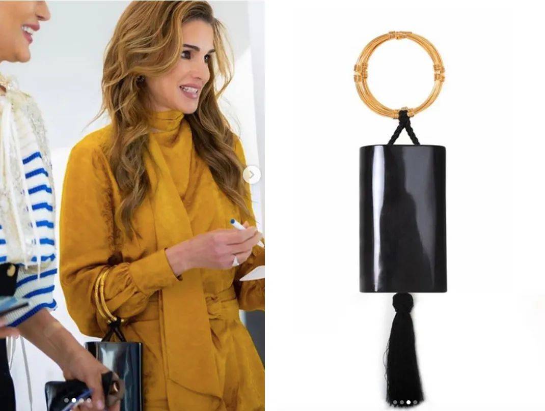 在比较轻松一点的场合,包包款式的选择就更宽泛一些了。约旦王后拉尼娅去访问莫扎的时候,就拎了一只度假风的手提包,流苏加手环的设计还蛮有异域风情的,来自小众品牌Sarah's bag~
