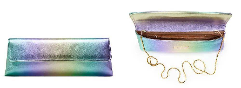 Magrit的手拿包设计风格也是比较抓人的,今年这只镭射长条状手拿包就很吸睛,感觉很适合搭配素色服装,搭配一根金属肩带,也可以做斜挎包。