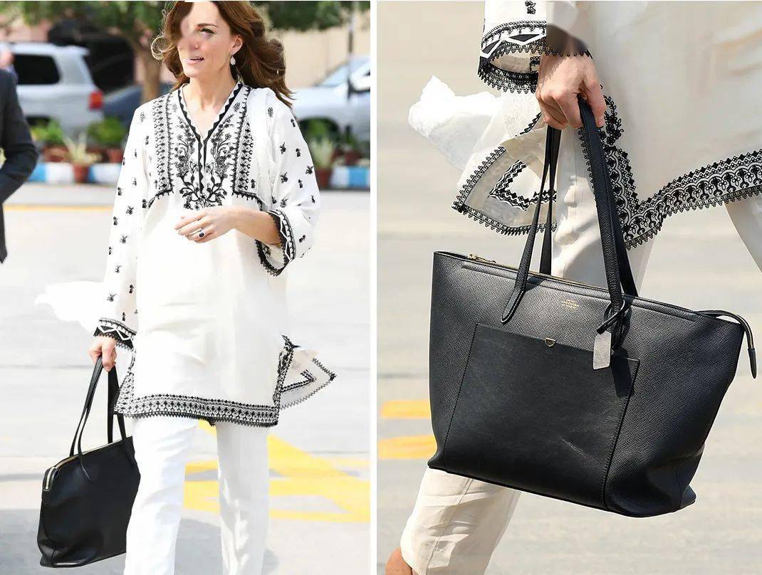 说到凯特爱用的托特包,除了大家耳熟能详的珑骧之外,就是来自英国的本土小众Smythson了,她之前外出访问就拿了一只他家的基础托特搭配度假风服装,当时这个look还蛮出圈的~