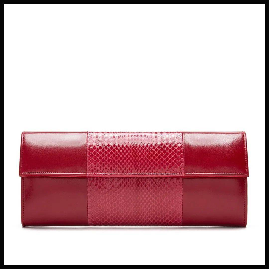 同款式还有一只大红色的,采用的小牛皮和蛇纹皮质拼接制作,风格更加高调隆重一些,会比较抬气场。