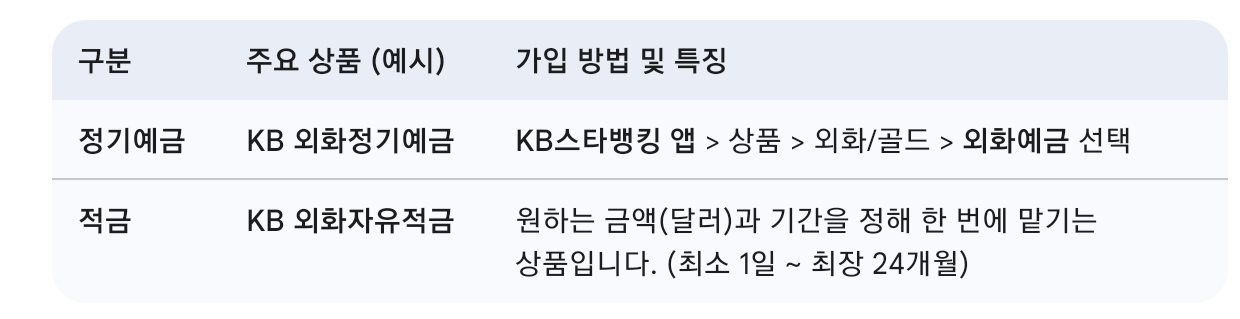 * KB스타뱅킹 앱에 접속합니다. * 하단 '상품' 메뉴를 누릅니다. * '외화/골드' 카테고리에서 **'외화예금'**을 선택합니다. * 원하는 상품(예: KB 외화정기예금)을 선택하고 **'가입하기'**를 누릅니다. * 가입 금액을 달러(USD)로 입력하고, 기간 등을 설정합니다. (가입 시점의 달러 이자율이 확정됩니다.) * 이때, 1단계에서 개설한 외화 입출금 통장을 출금 계좌로 지정하여 가입합니다.