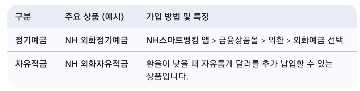 가입 방법 (NH스마트뱅킹 앱): * NH스마트뱅킹 앱에 접속합니다. * 하단 '금융상품몰' 메뉴를 누릅니다. * '외환' 카테고리에서 **'외화예금'**을 선택합니다. * 원하는 상품을 선택하고 **'가입'**을 누릅니다. * 가입 금액을 달러(USD)로 입력하고, 기간 등을 설정합니다. * 1단계에서 개설한 외화 입출금 통장을 출금 계좌로 지정하여 가입을 완료합니다.3단계: 가입 시 유의사항 * 가장 큰 수익은 환차익: 외화 예금의 이자율(연 3~4%대)보다 환율 변동에 따른 환차익이 전체 수익률에 더 큰 영향을 미칩니다. (환율이 낮을 때 달러를 사서, 환율이 높을 때 파는 것이 핵심입니다.) * 이자소득세: 외화 예금 이자에는 원화 예금과 동일하게 15.4%의 이자소득세가 부과됩니다. (환차익은 비과세) * 예금자 보호: 국내 은행의 외화 예금도 원화 예금과 합산하여 최대 5천만 원까지 예금자 보호가 적용됩니다.요약하자면, 모바일 앱에서 외화 통장을 개설하고, **최대 환율 우대(90%)**를 적용받아 원화를 달러로 환전한 다음, 그 달러를 외화 예/적금 상품에 넣으시면 됩니다.