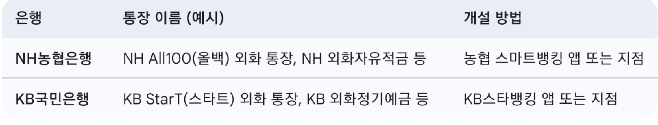 * 가장 쉬운 방법: 각 은행의 모바일 뱅킹 앱에서 '외화 통장 개설'을 검색하여 비대면으로 개설합니다. (신분증 필요)