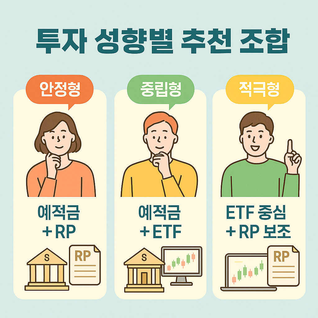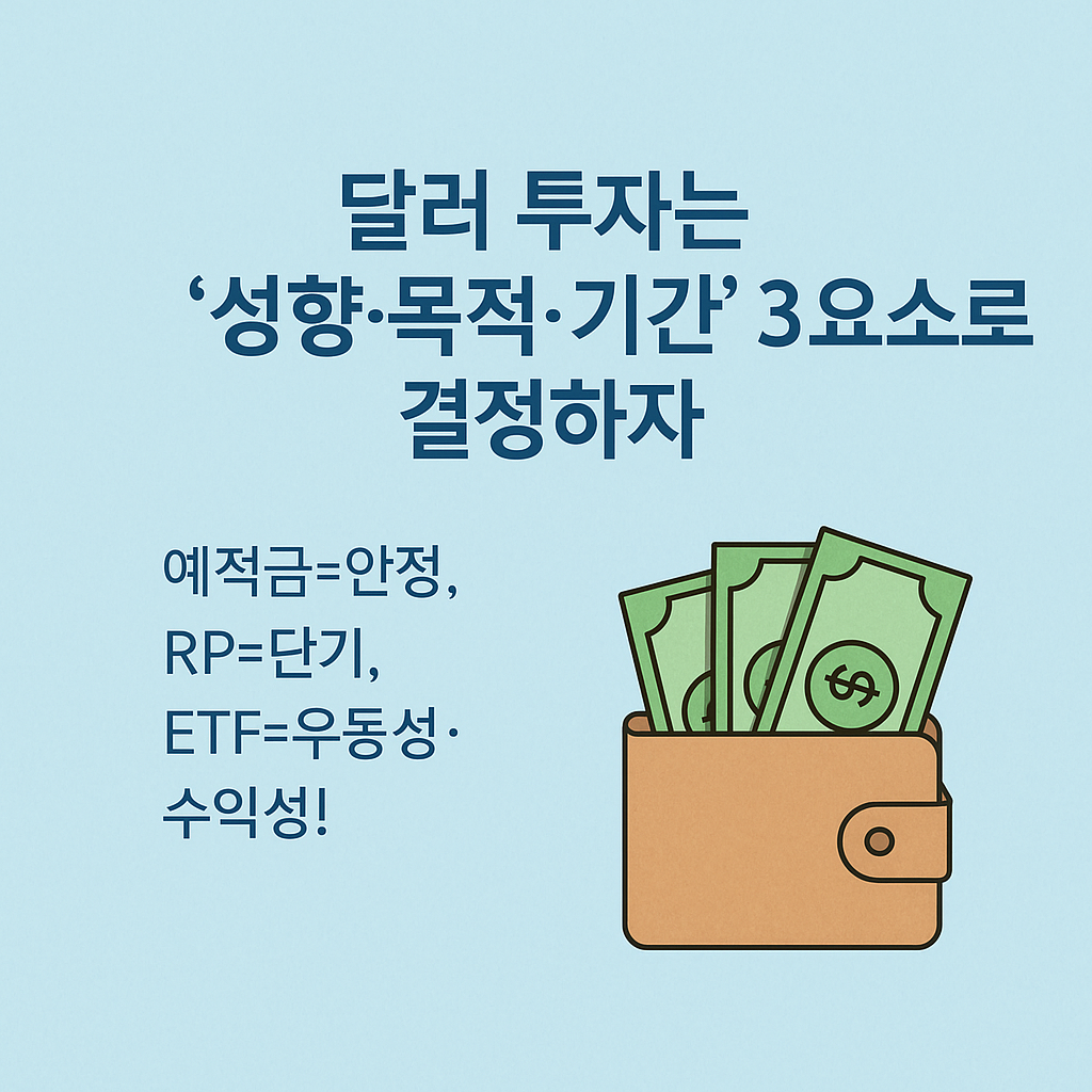 👉 예적금 + ETF 반반환율 변동에 대한 유연한 대응위험 대비 수익 균형● 적극형👉 ETF 중심 + 보조로 RP환율 급등 구간에서 고수익 기대단기 이벤트 대응 쉬움달러 투자에서 중요한 것은 ‘무조건 수익률’이 아니라 본인의 목적과 리스크 수용 범위입니다.예적금은 안정성, RP는 단기 활용, ETF는 변동성 대응이라는 차이를 이해하면 자신에게 맞는 환테크 전략을 쉽게 만들 수 있어요.