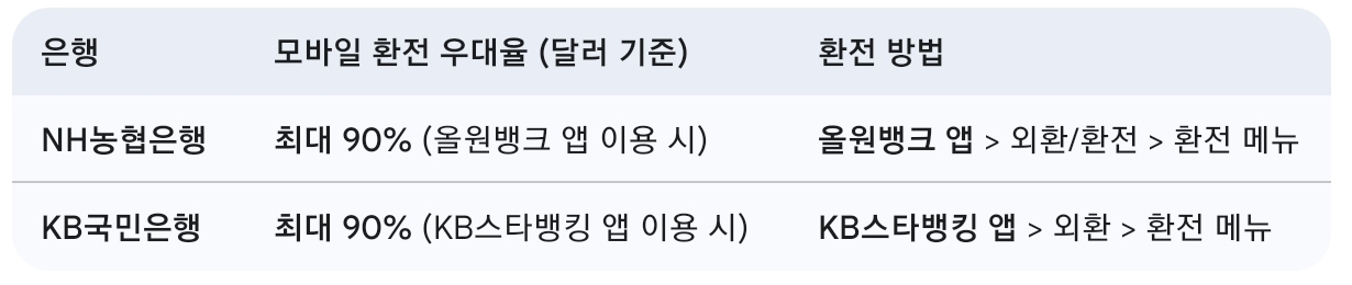 2. 환전 및 환율 우대 (수수료 절감 핵심)가장 중요한 것은 원화를 달러로 바꿀 때 수수료를 줄이는 것입니다.