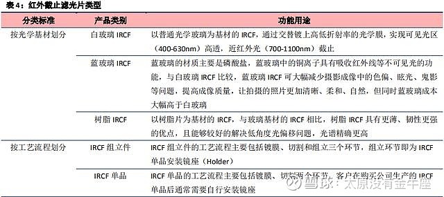 红外截止滤光片根据使用的光学基材不同可以划分为白玻璃 IRCF、蓝玻璃 IRCF 和树脂 IRCF,根据工艺流程不同可以划分为 IRCF 组立件和 IRCF 单品