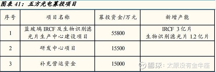 项目建成后,公司将新增年产 5 亿套蓝玻璃滤光片组立件的生产能力,其中,单摄像头组立件年产能为 8000 万套,双摄像头组立件年产能为 4.2 亿套;同时新增年产 2.5亿套生物识别滤光片组立件的生产能力。