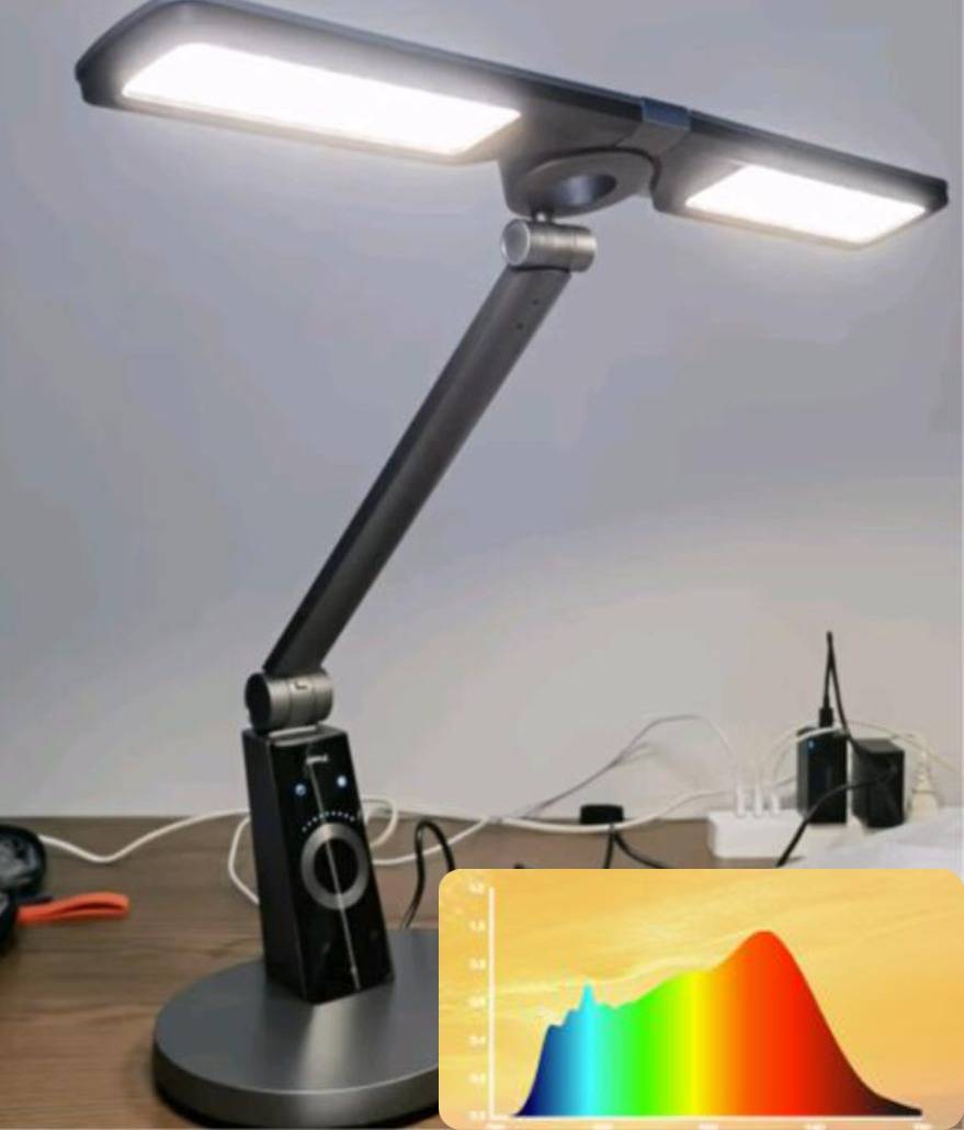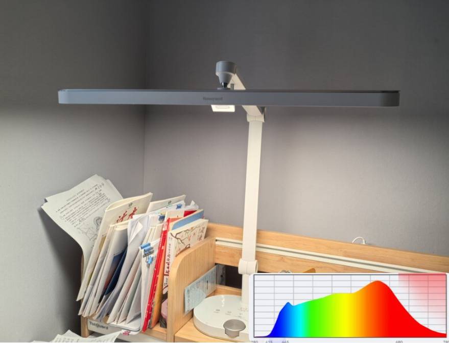 学生护眼台灯哪个牌子最好性价比高?霍尼韦尔A9护眼台灯的灯身采用了铝型材料打造而成,硬度高整体耐用不宜算坏。触控板则选用了肤感钢化玻璃能够防指纹不留痕迹,始终保持操作面板的干净整洁。55cm长条形发光面可大幅扩展照明区域,轻松覆盖1.2米桌面,能满足日常阅读等场景的用光需求。功能上配备了入座感应和亮度自适应等实用功能,使用起来更为便捷。不过从光谱表现来看,其蓝光存在两个明显波峰,长期使用可能会让孩子产生视觉疲劳。