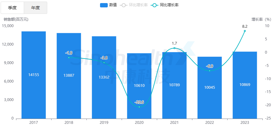 据中康开思系统显示,2023年肝病治疗药物在国内等级医院和零售市场销售总额达175亿元。其中,在国内等级医院销售额约109亿元,同比增长8.2%。