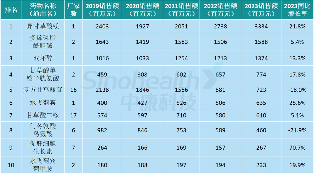 此外,拿下第一名的异甘草酸镁涨幅也明显,近3年保持正增长,2023年销售额更是首次突破30亿元。该药自纳入2017年版医保乙类目录后,至今被还未被纳入国家集采,从企业销售看,只有原研厂家正大天晴药业拥有生产批文。