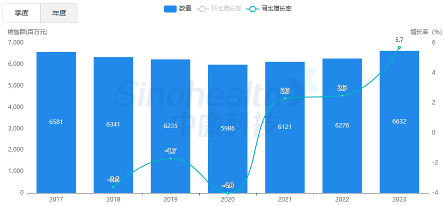 同样下滑的还有复方甘草酸苷。自2020年,复方甘草酸苷口服常释剂被纳入河南省首次药品集中采购品种后,又先后被多个省份及省际联盟纳入到带量采购目录范畴。从数据上看,复方甘草酸苷的销售额长期处于负增长的态势,在2022年下滑幅度最大,达44.4%。022023零售终端肝病治疗药销售超66亿零售市场方面,2023年肝病治疗药的市场规模为66.32亿元,同比增长5.7%。整体来看,肝病治疗药零售市场趋于稳定,近7年保持60亿左右的销售额。