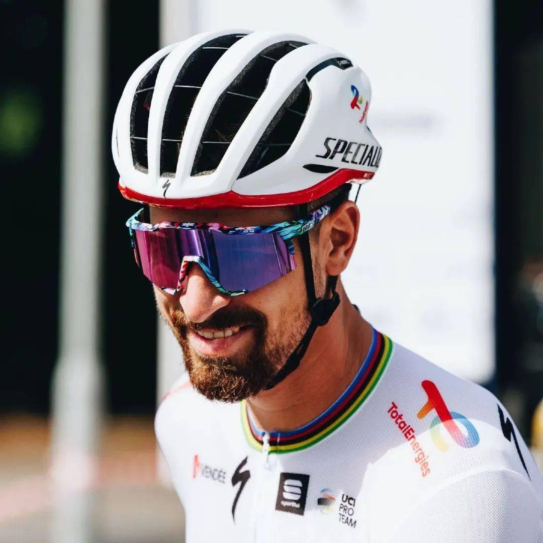 萨甘戴上新头盔和新眼镜(也是针对环法的特别版)。