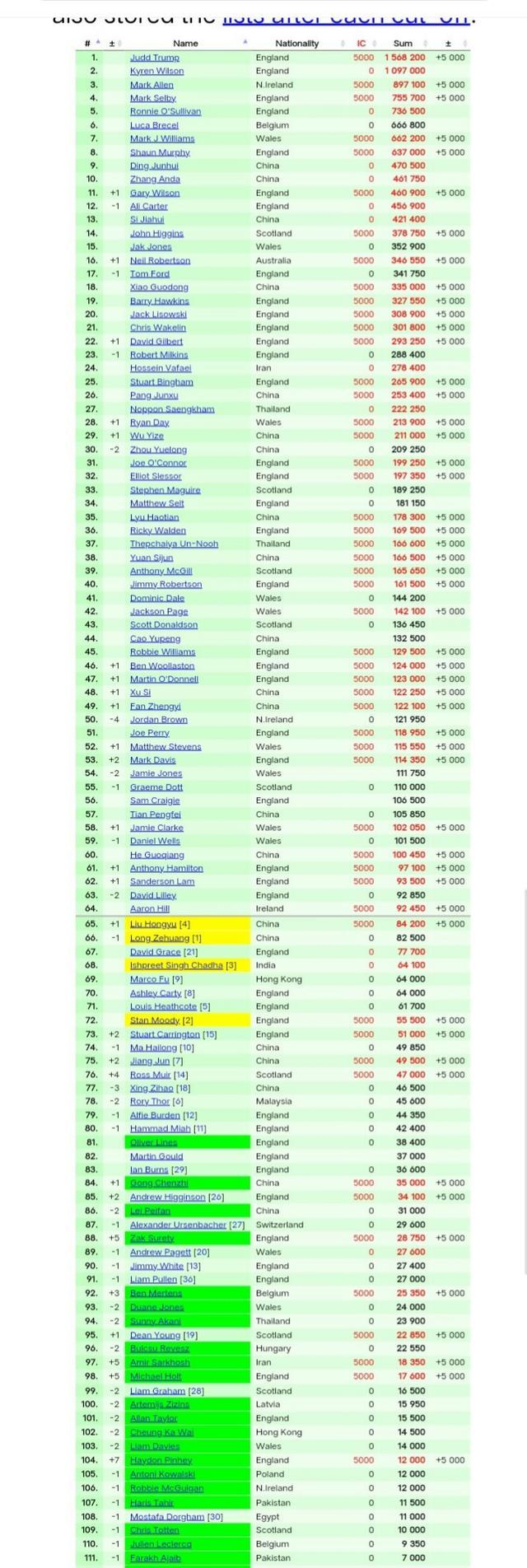 斯诺克最新世界排名(下一站国锦赛,正赛首轮奖金已统计在内)