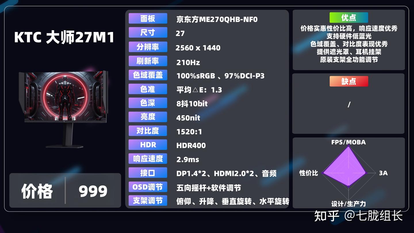 KTC在今年卷的力度明显是要强于其他品牌的,就今年就开了三套全新的外壳模具,并且全线压低的价格,而这个大师27M1的模具水平,基本在1500元以内可以说是吊打一切了,原装给到了遮光罩,屏幕背后还有可收缩的耳机挂架,底座为相当节省空间的平板,并且原装支架还是调节拉满的全功能调节,水平旋转调节的质感相当不错,有那种卡塔卡塔声的刻度感,模具拉满之后,显示素质也是无可挑剔,GTG响应速度进入2开头的顶级T1水平,亮度对比度表现也非常优秀,色彩参数也无可挑剔,确实是对得起“大师”这个名号的,如果你想在千元预算购买一款表现相当全面的机器,KTC 大师27M1非常值得考虑