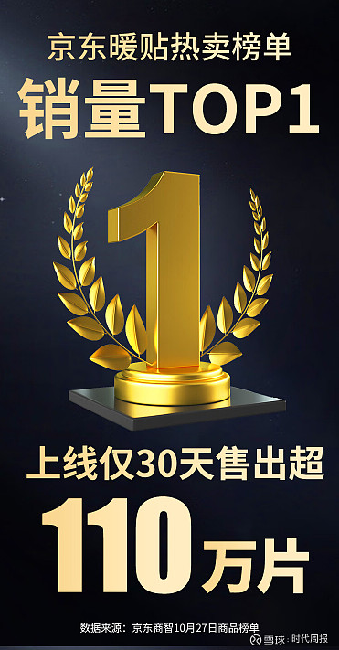 这款暖宝宝的介绍页面称,暖贴三秒速热,可以55℃恒温,发热时长可持续10小时。据京东商智10月27日商品榜单,这一系列的暖宝宝在京东上线30天就售出超过110万片,为京东暖贴热卖榜单销量第一。