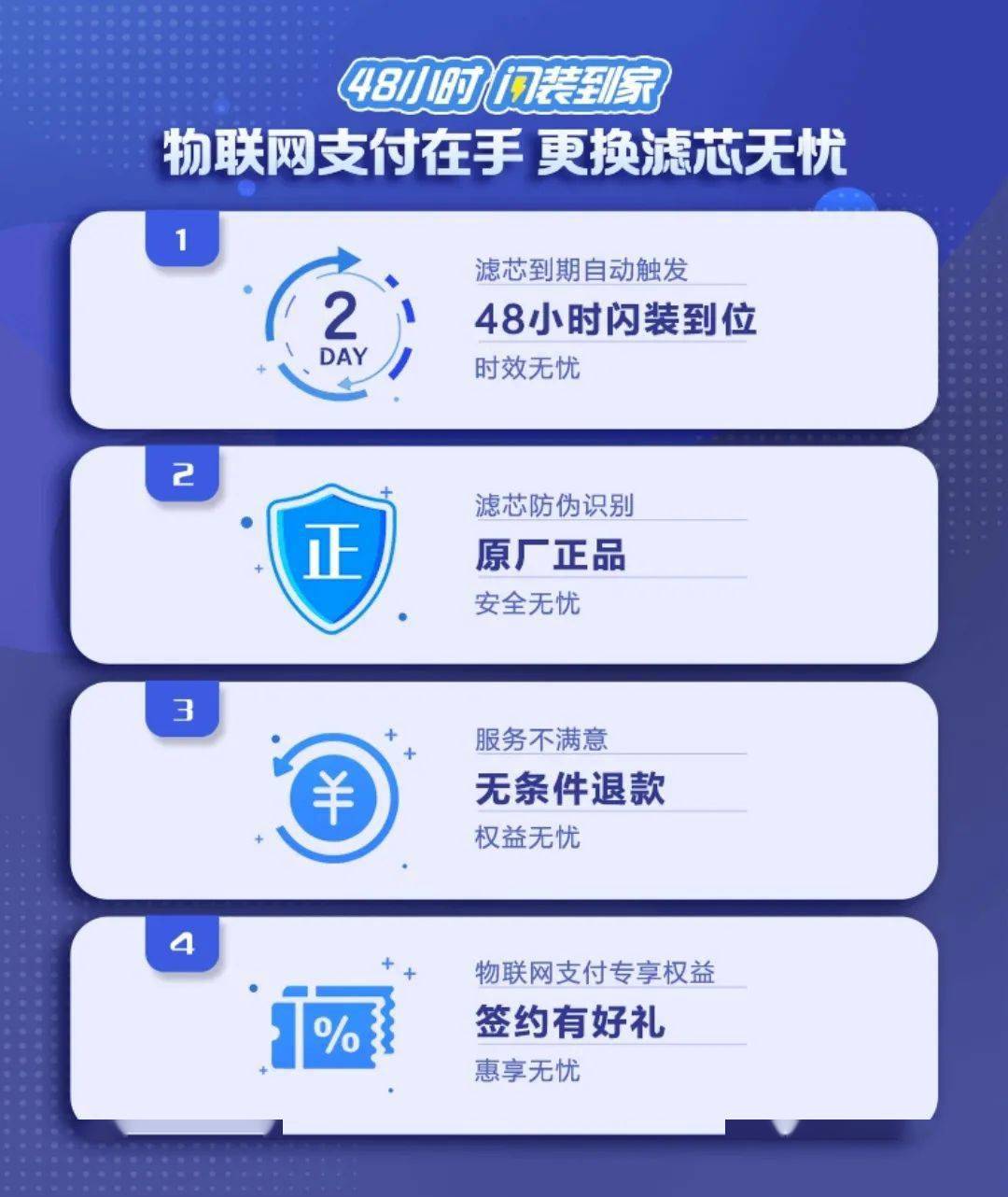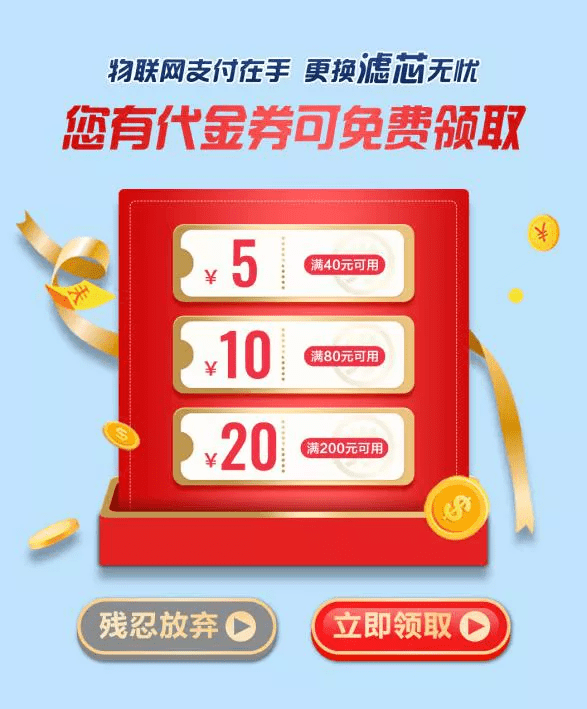 针对物联网支付签约用户可免费领取专享滤芯代金券,订单下单时自动使用抵扣价格;另外物联网支付的订单,售后人员上门换滤芯免收上门服务费,感觉省了“几个亿”从此换芯付费无忧。