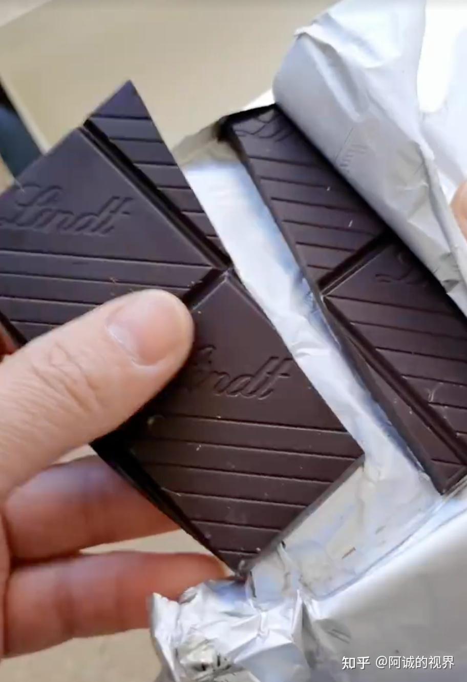 你再把Lindt瑞士莲巧克力放到耳边,折下一片,就能听到明显清脆的“咔嚓”的折断声。将巧克力放到鼻前闻它的香味,除了巧克力味道,你还有没有闻出其他香味,比如香草或水果味?