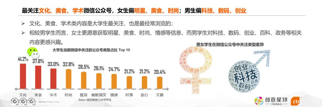 ● 在关注信息的内容上,大学生更习惯于从微信公众号上关注文化、美食、学术等与自己的生活和学业息息相关的信息。