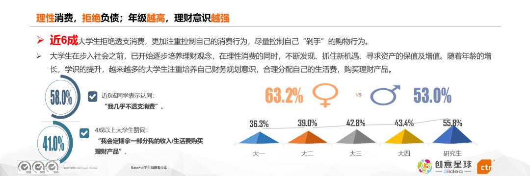 ● 调研显示,近6成的大学生拒绝透支消费,他们更加注重控制自己的消费欲望,杜绝自己“剁手”的购物行为。女学生比男学生更加认同理性消费,拒绝负债。